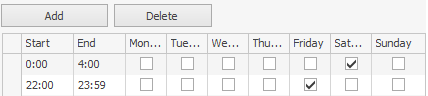 Możesz ustawić więcej niż jeden okres dla rabatu. Na przykład rabat 50% jest aktywny od 22:00 w piątek do 04:00 w sobotę. Ustaw dwa okresy: od 22:00 do 23:59 w piątek oraz od 00:00 do 04:00 w sobotę.