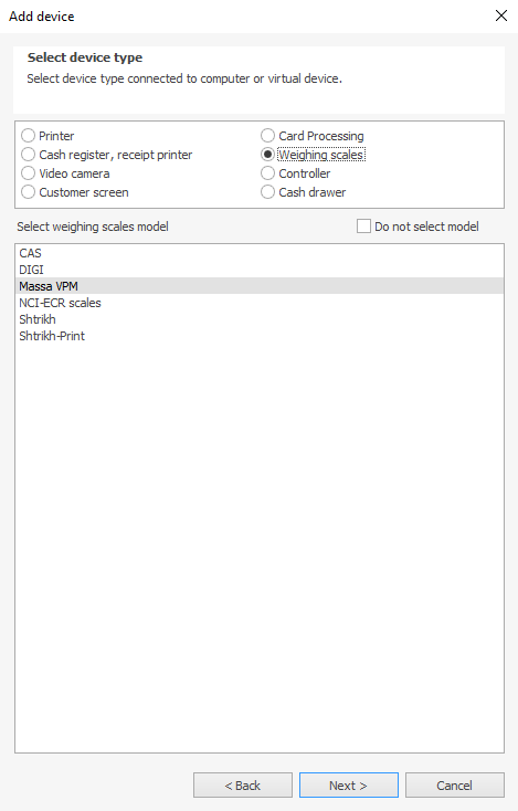 - Wybierz Wagę jako Typ urządzenia. Zobaczysz listę obsługiwanych modeli wag. Wybierz wymagany model i kliknij Dalej.