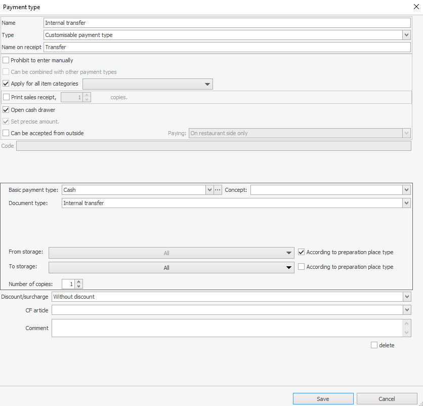 - W polu Podstawowy typ płatności wybierz wcześniej utworzony typ płatności z typem "Bez przychodu" lub typ "Gotówka". W obecnej wersji systemu jako podstawowy można użyć dowolnego typu płatności, z wyjątkiem typów płatności niestandardowych.