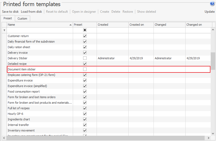 - Ponownie wybierz Formularz etykiety pozycji dokumentu na karcie Gotowe i kliknij Wczytaj z dysku. Znajdź wcześniej zapisany szablon i kliknij Otwórz.