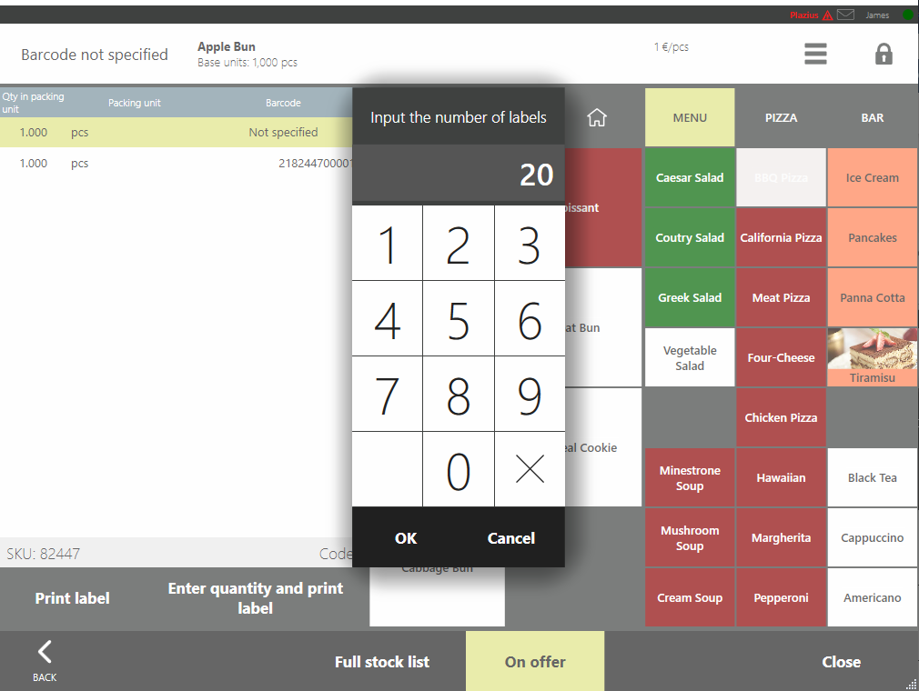 - Stuknij OK. Okno Ilość zostanie zamknięte, a metka cenowa z kodem kreskowym zostanie wydrukowana. W przypadku towaru ważonego system zawsze wydrukuje jedną etykietę z podaną wagą. Kod kreskowy towaru ważonego jest generowany automatycznie na podstawie prefiksu określonego w Syrve Office, kodu towaru (SKU) oraz jego wagi.