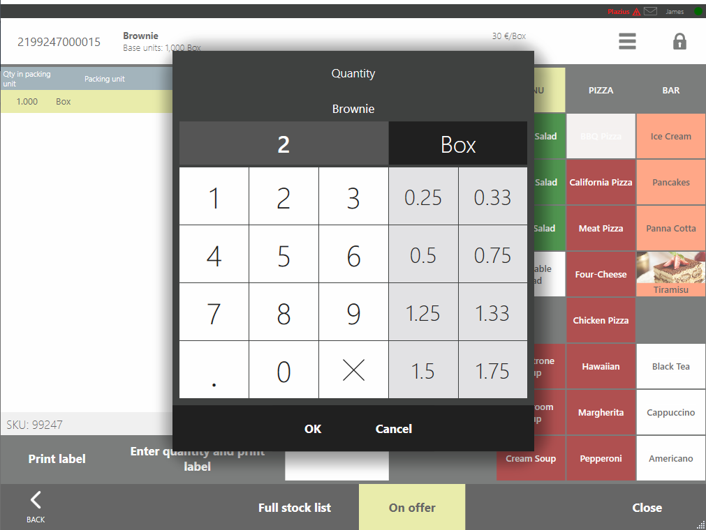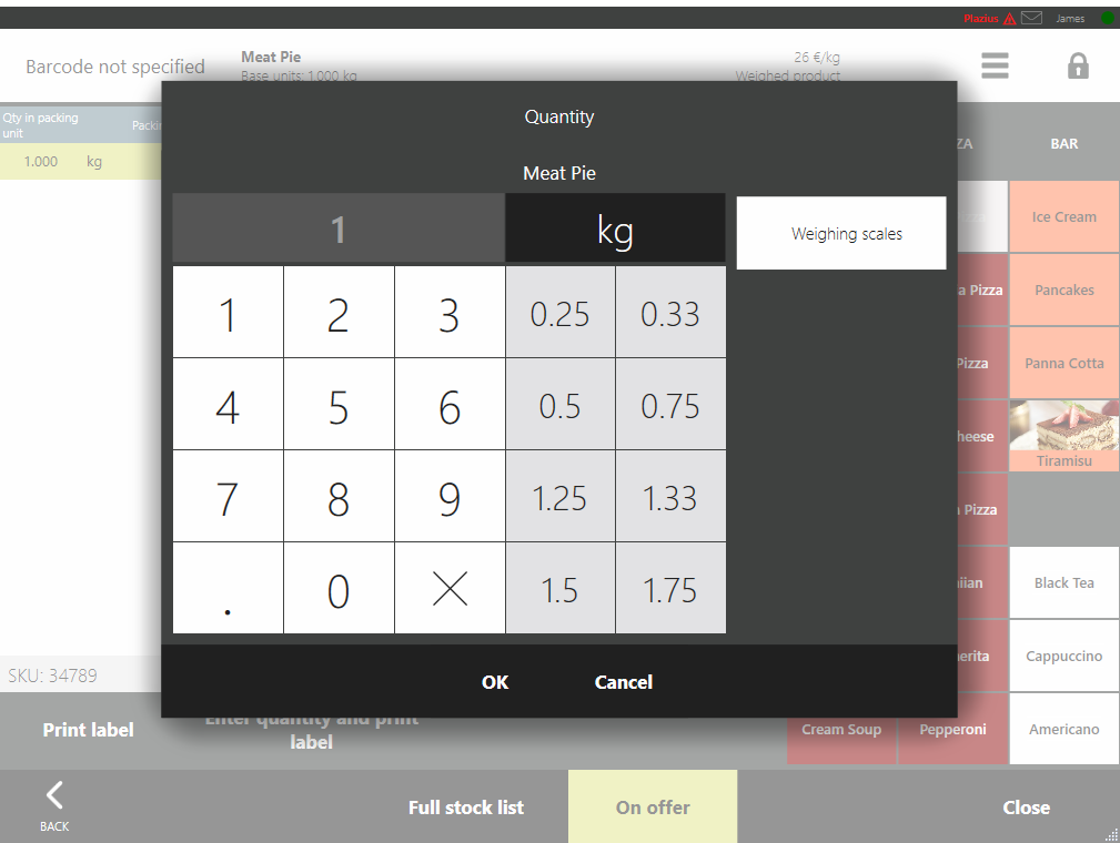 Jeśli Twój terminal jest podłączony do wagi i drukarki kodów kreskowych, możesz używać tego stanowiska do dodawania jednostek opakowań towarów ważonych. Na przykład możesz zważyć kawałek ciasta i wydrukować metkę cenową z kodem kreskowym.