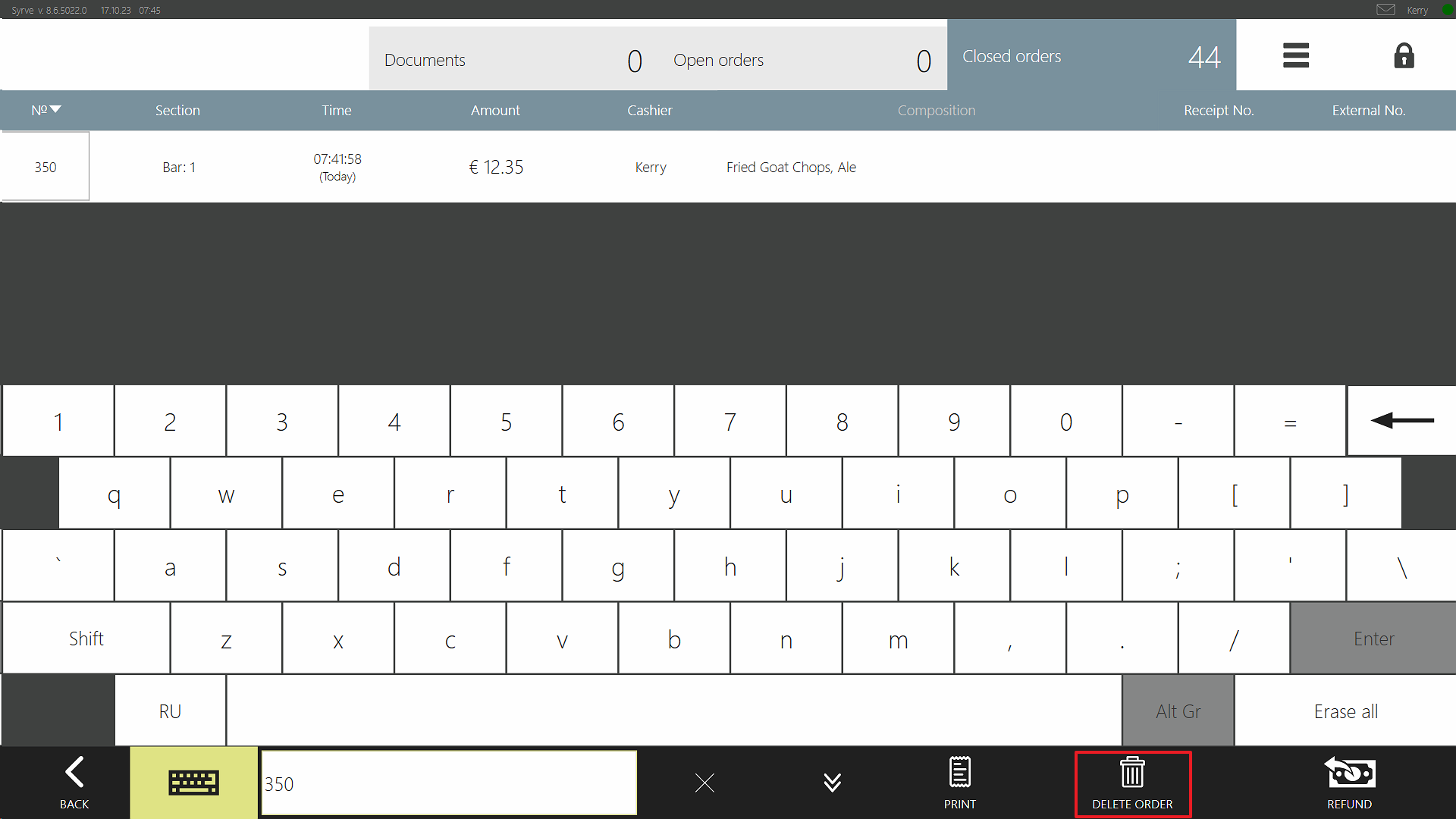 - Znajdź na liście zamówienie, które chcesz zwrócić. Aby szybko wyszukać, stuknij przycisk klawiatury ekranowej i wpisz nazwisko pracownika, który zarejestrował zamówienie lub numer stolika.