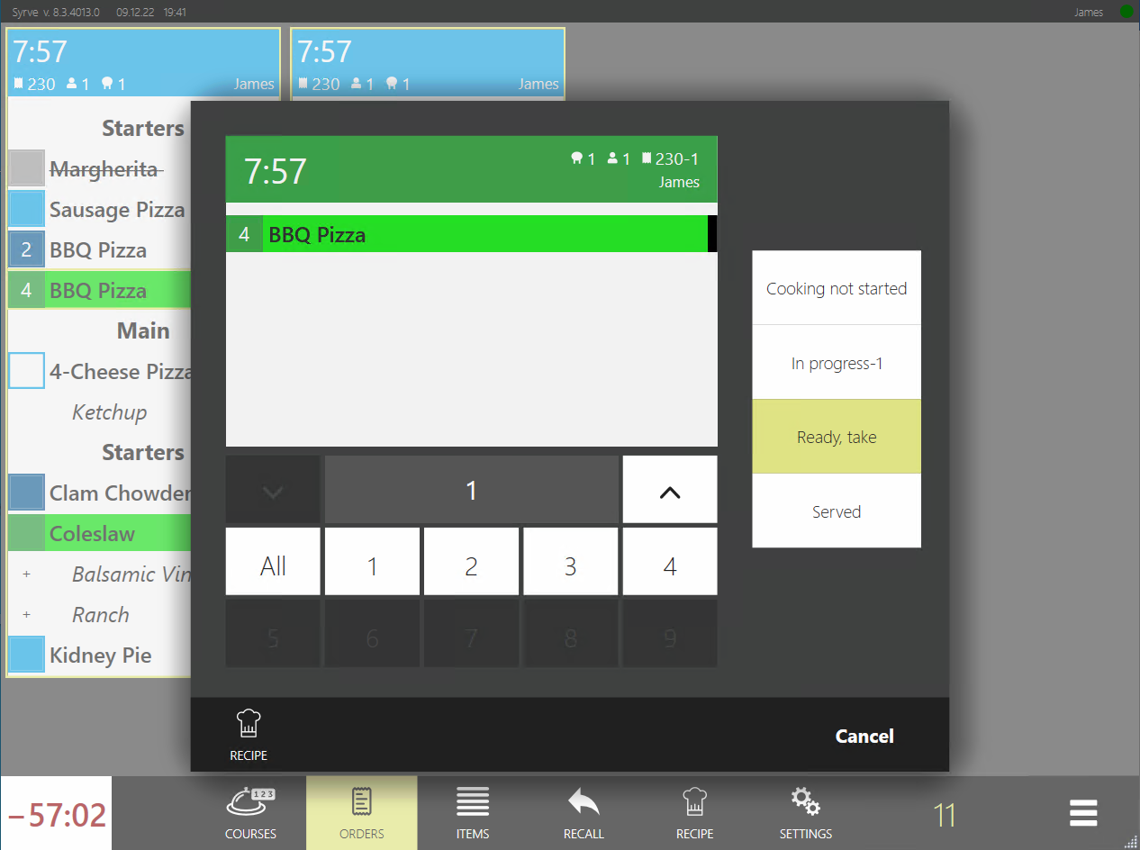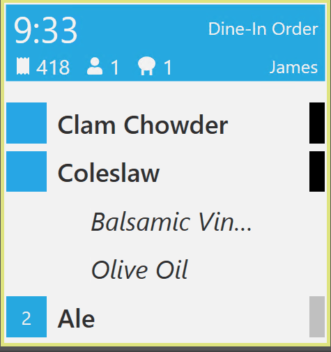 - Kelner dodaje pozycje do zamówienia i drukuje je do kuchni. Pozycje pojawiają się na ekranie kuchni ze statusem Czas gotowania. Na ekranie wyświetlany jest czas przygotowania. Jeśli minęła połowa domyślnego czasu gotowania, a przygotowanie jeszcze się nie rozpoczęło, pozycje automatycznie stają się pilne.