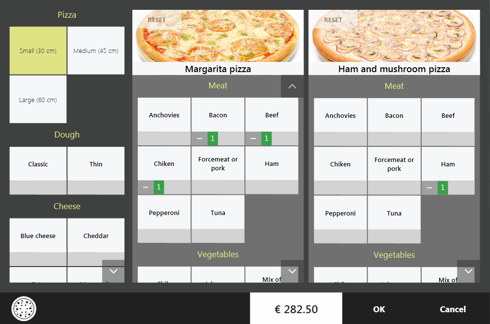Zdarza się, że punkty sprzedaży oferują swoim gościom możliwość komponowania pizzy, tj. wyboru nie tylko rozmiaru, ale także rodzaju ciasta (grube, cienkie, zamknięte) oraz dodatków. Co więcej, pizzę można podzielić na dwie części i wybrać różne składniki dla każdej połowy. Takie produkty można skonfigurować w aplikacji back-office na komputerze, korzystając ze schematów modyfikatorów.