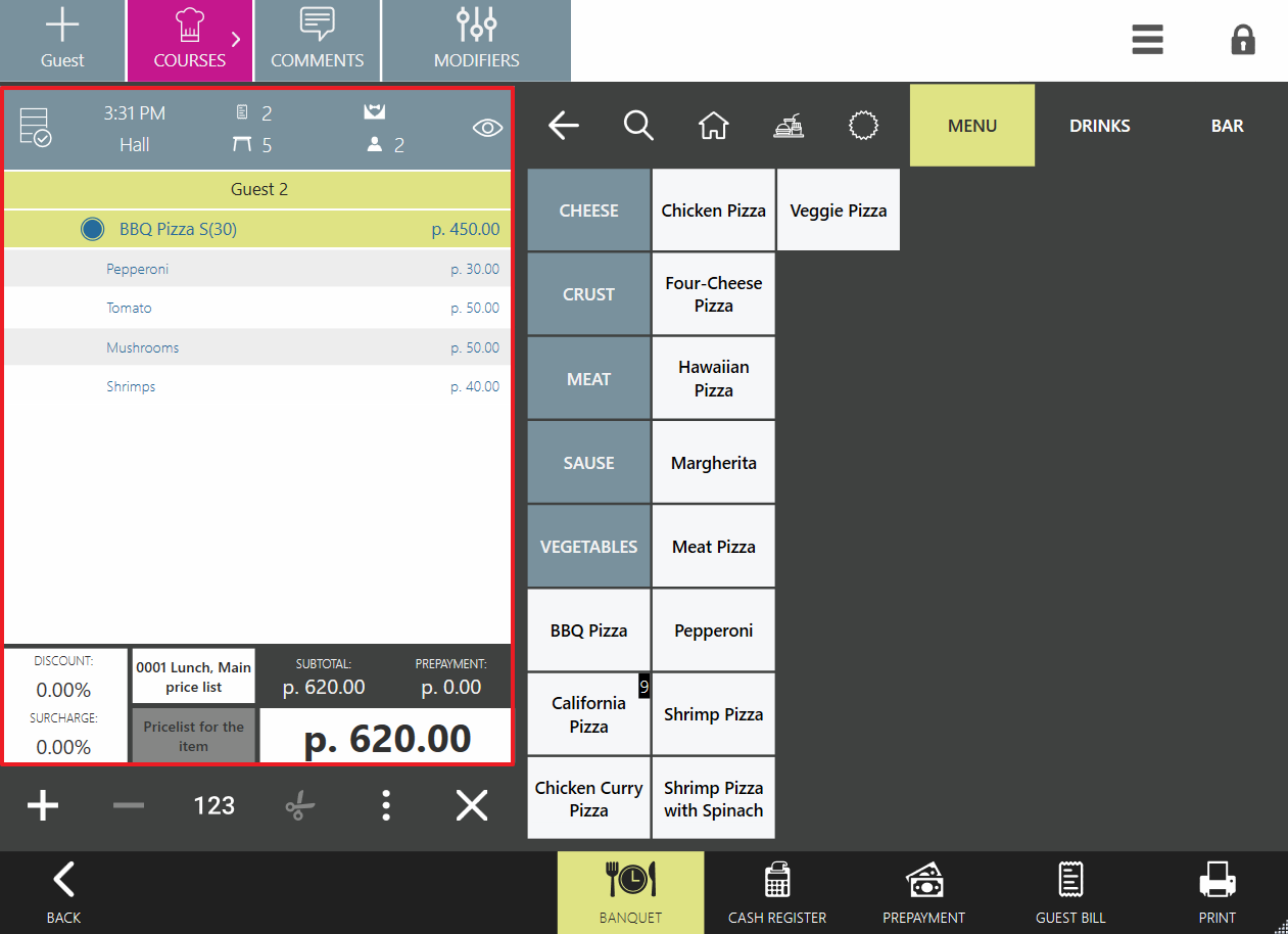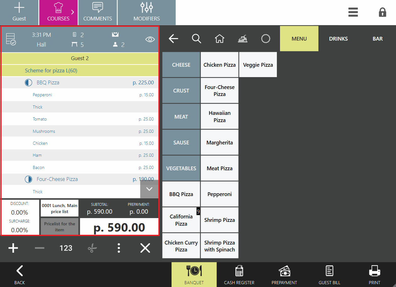 Nazwa dania podana w zamówieniu zawiera nazwy schematu modyfikatorów i skali rozmiarów. Następnie pojawiają się modyfikatory wspólne dla obu połówek. Każda połowa ma własną listę składników. Ten typ dania korzysta ze wszystkich funkcji dostępnych dla zwykłych dań, z wyjątkiem dzielenia między gości ( jest nieaktywny).