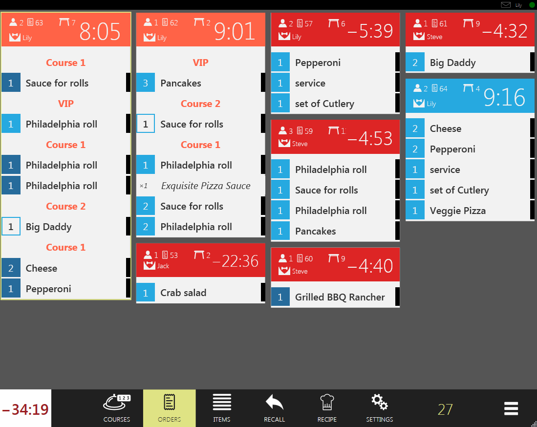 - Dania. Zamówienia są najpierw podzielone i pogrupowane według dań, a następnie według czasu przygotowania rosnąco. Najpilniejsze danie jest podane w lewym górnym rogu. Pilne pozycje muszą być przygotowane i podane jako pierwsze. Takie pozycje są wyróżnione.