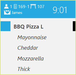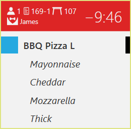 Status przygotowania pozycji jest podany na ekranie kuchni jako kolorowy prostokąt po lewej stronie nazwy pozycji. Status zamówienia jest wskazany kolorem czcionki zamówienia.