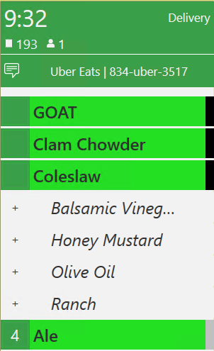 Modyfikator i główna pozycja, które są przygotowywane razem, będą wyświetlane razem. Taki modyfikator ma ten sam status i kolor co główna pozycja. Sklep i czas przygotowania są pokazywane tylko dla głównej pozycji. Każda pozycja ma swoje modyfikatory (jeśli są) wyświetlane tak, jak na ekranie zamówienia.