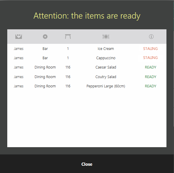 Gdy pozycja jest gotowa, kucharz oznacza ją jako gotową na ekranie. Na terminalu kelnera pojawia się komunikat informujący o konieczności zabrania pozycji.