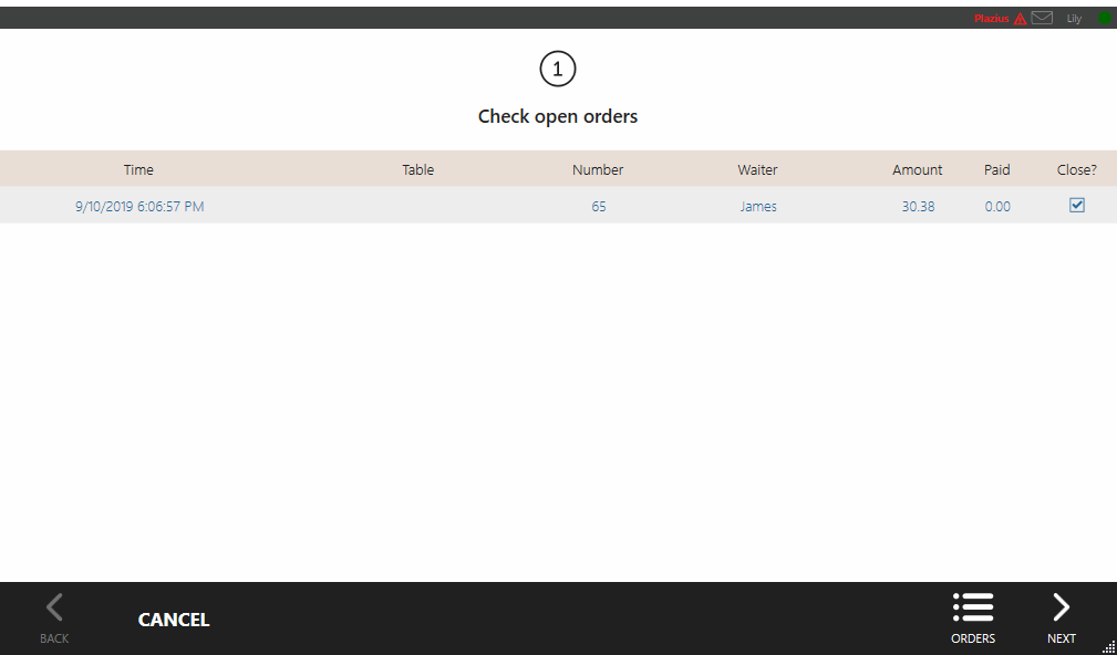 Krok 1. Sprawdź otwarte zamówienia. Jeśli na terminalu są otwarte zamówienia (określono pozycje menu, ale nie dokonano płatności), na ekranie zostaną wyświetlone szczegóły zamówienia, takie jak data i godzina, numer zamówienia, nazwisko kasjera oraz kwota zamówienia. Zależnie od ustawień Syrve Office, otwarte zamówienie może zostać automatycznie zamknięte, przeniesione do następnej zmiany kasy lub wymuszone do zamknięcia przez menedżera.