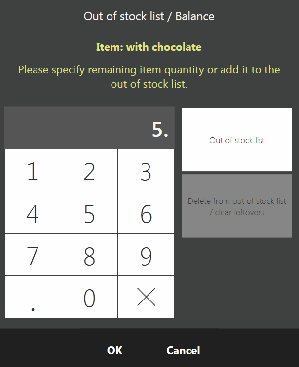 3. Stuknij w niego i wybierz (z pełnego lub szybkiego menu) pozycję, dla której chcesz określić pozostałą ilość w kuchni lub dodać ją do listy braków magazynowych. Otworzy się okno do określania stanu zapasów pozycji.