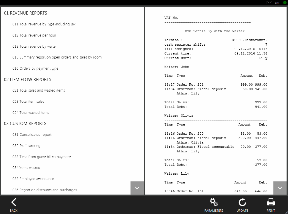 Wybierz 038 Zapłata kelnerowi w bloku raportów specjalnych, aby otworzyć raport w > Raporty