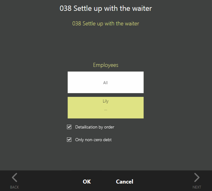 Dodatkowy krok jest wyświetlany kierownikowi podczas zamykania zmiany kasy, gdy kelnerzy mają zaległe długi. Przejdź do spłaty długu, klikając przycisk Dług kelnera. Kliknij przycisk Dalej, aby przenieść długi na następną zmianę.
