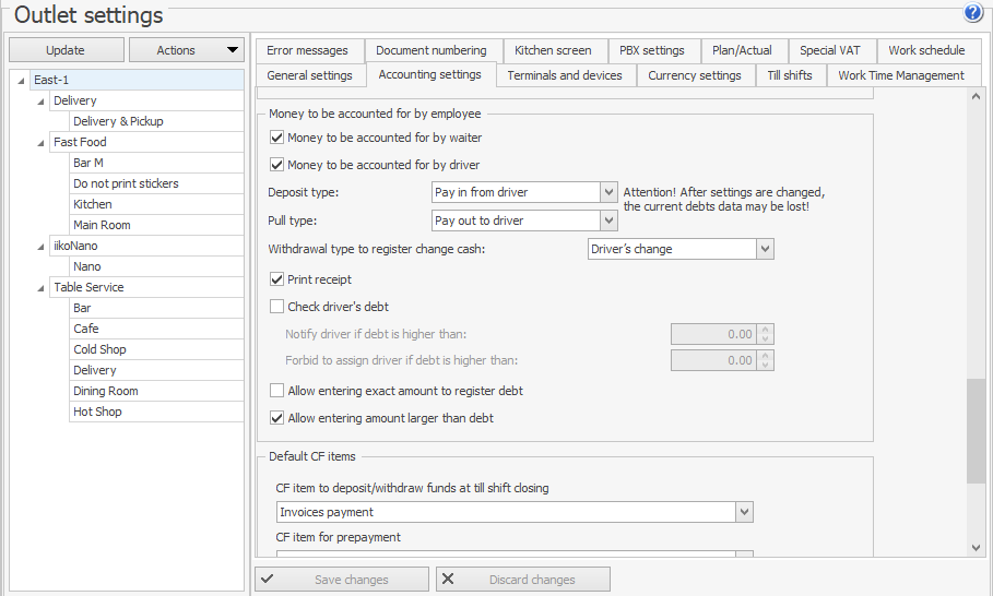 Możesz umożliwić kelnerom wpisywanie dokładnych kwot podczas rozliczania długu. W tym celu przejdź do zakładki Ustawienia księgowości w ustawieniach sklepu Syrve POS i zaznacz opcję Pozwól na wpisanie dokładnej kwoty przy rozliczaniu długu w bloku Pieniądze do rozliczenia przez kelnerów. Funkcja ta jest domyślnie wyłączona.