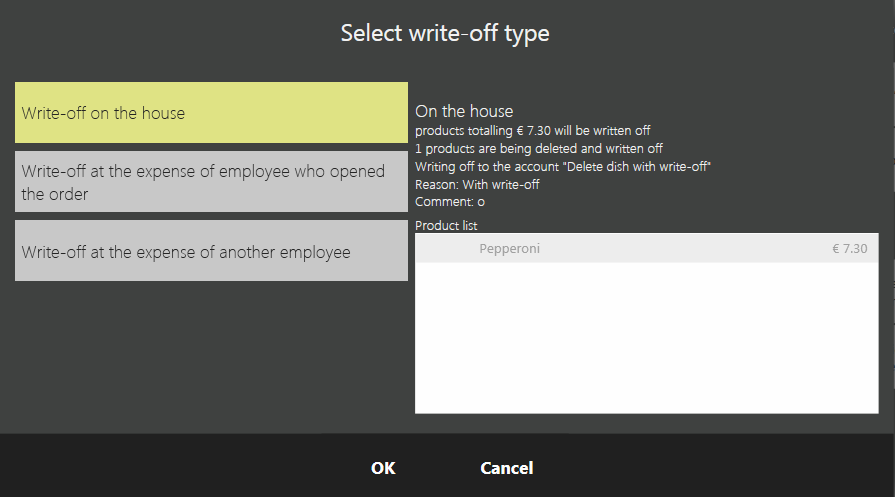 - Jeśli usunięcie wiąże się z rozliczeniem produktu ze stanu magazynowego, wybierz typ rozliczenia dania, czyli na czyj koszt. Możesz rozliczyć dania na koszt firmy, na koszt kelnera obsługującego zamówienie lub na koszt innego pracownika, w zależności od ustawień warunku rozliczenia.