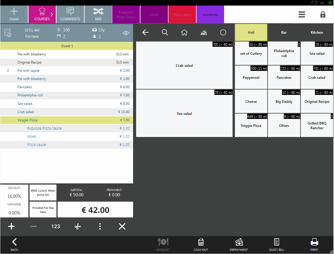 Dania są przygotowywane partiami, a każda partia ma zarejestrowany czas przechowywania w systemie. Jeśli istnieje kilka partii tego samego dania, na ekranie wyświetlany jest czas przechowywania najstarszej niesprzedanej partii. Ponadto, jeśli istnieje przeterminowana partia, liczba dań w niej zawartych jest podświetlona na czerwono.