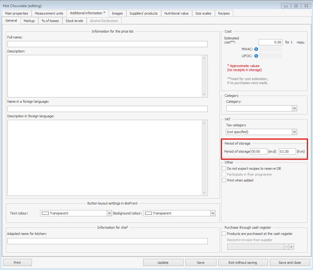 - Określ przedział czasowy, w którym danie pozostanie świeże w Bloku okresu przydatności na karcie Dodatkowe informacje > Ogólne. Tutaj możesz podać krótką nazwę używaną w kuchni, która będzie wyświetlana na przycisku dania w Syrve POS.