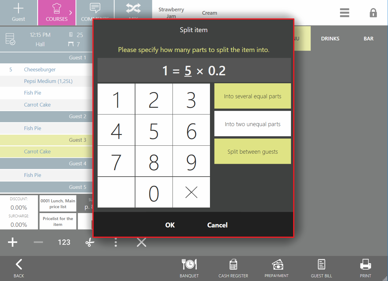 Poproszono Cię o podzielenie ciasta na równe porcje między wszystkich gości (5 gości). Wybierz danie ciasta w zamówieniu i kliknij , a następnie kliknij OK. Każdy gość otrzyma 0,2 część ciasta (1 = 5 × 0,2).