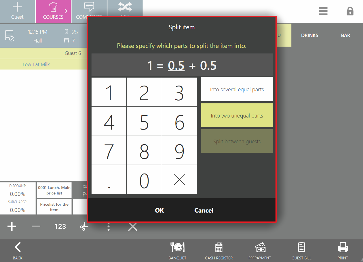- Kliknij OK. Zamówienie jednego gościa pokaże dwie części dania.