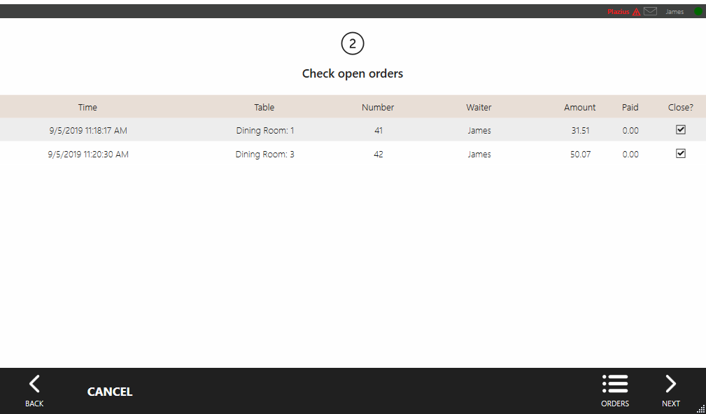- Aby przejść do następnego kroku, stuknij DALEJ. Jeśli podczas sprawdzania otwartych zamówień zdecydujesz się nie zamykać zmiany, a zamiast tego wrócić do głównego ekranu pracy, aby rozwiązać sytuację (zapłacić, odpisywać lub usunąć zamówienia), stuknij ANULUJ.