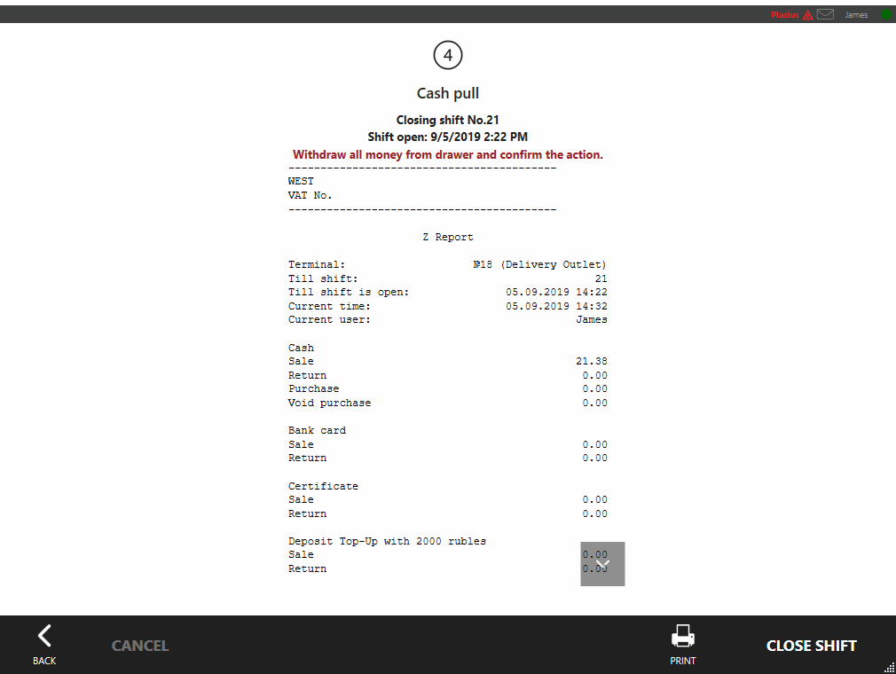 Pod koniec dnia menedżer wraz z kasjerem zamykają zmianę kasy na każdym POS w restauracji. Przed zakończeniem zmiany zaleca się, aby pracownicy przygotowali wszystkie dokumenty związane z operacjami wpłat i wypłat.