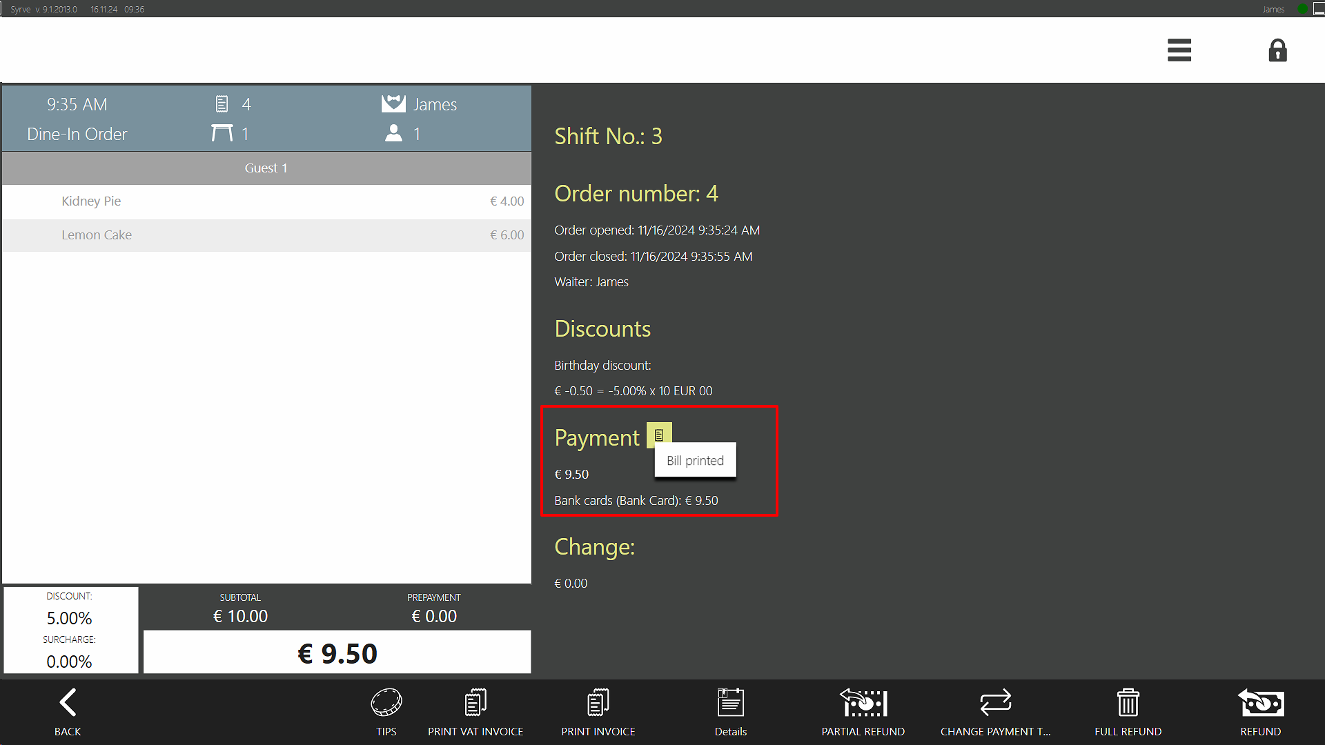 Jeśli odpowiednie ustawienia zostały wprowadzone w Syrve Office, to przy płatności za zamówienie zostanie również wydrukowany bilet kuchenny. Bilet będzie zawierał tylko te dania, które nie zostały wcześniej wydrukowane.