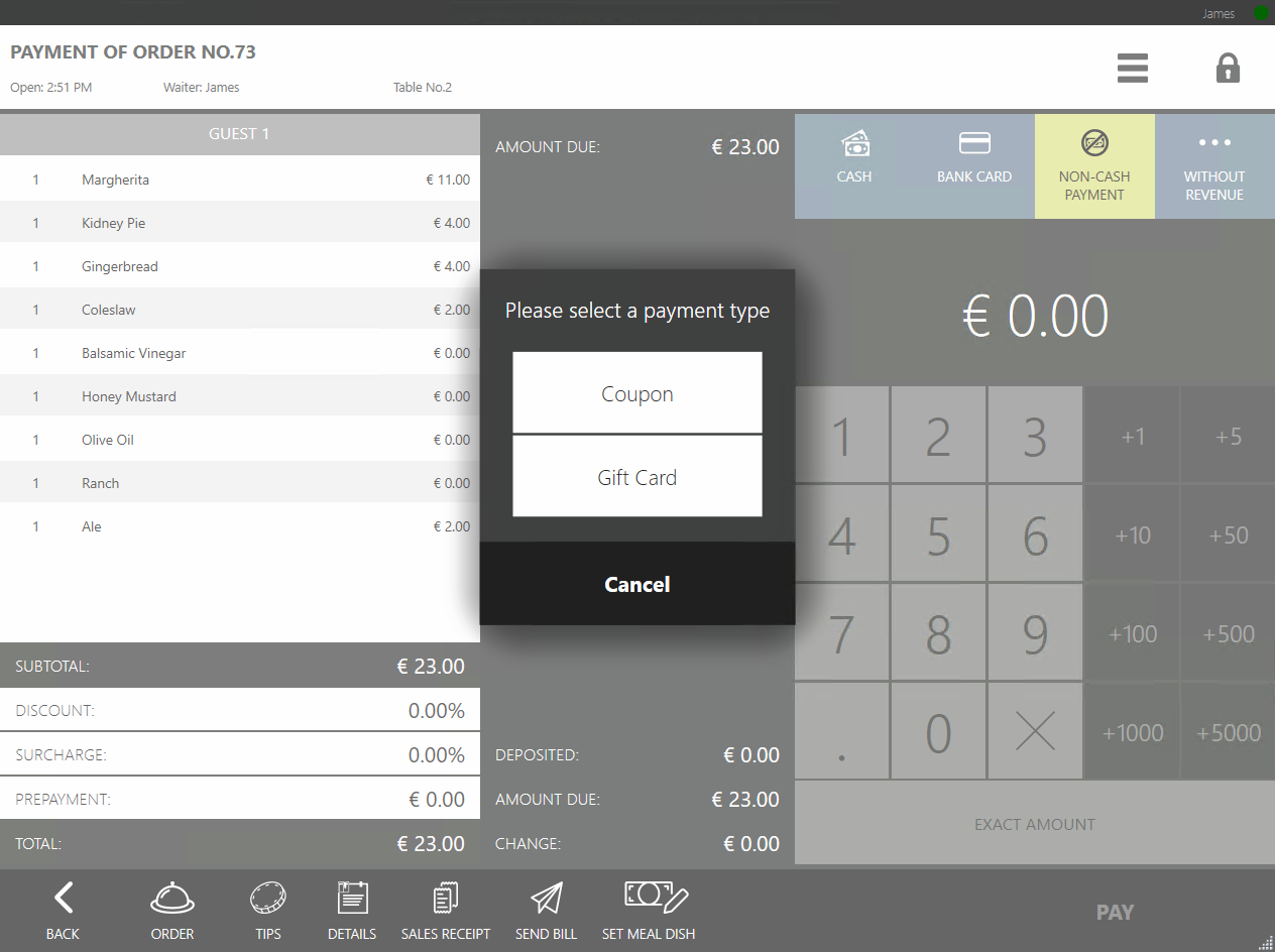 Zaokrąglenie działa niezależnie od typu płatności: fiskalnej lub niefiskalnej, a nawet jeśli używasz punktów bonusowych Syrve Loyalty. W takim przypadku kwota zamówienia może być tylko liczbą całkowitą.