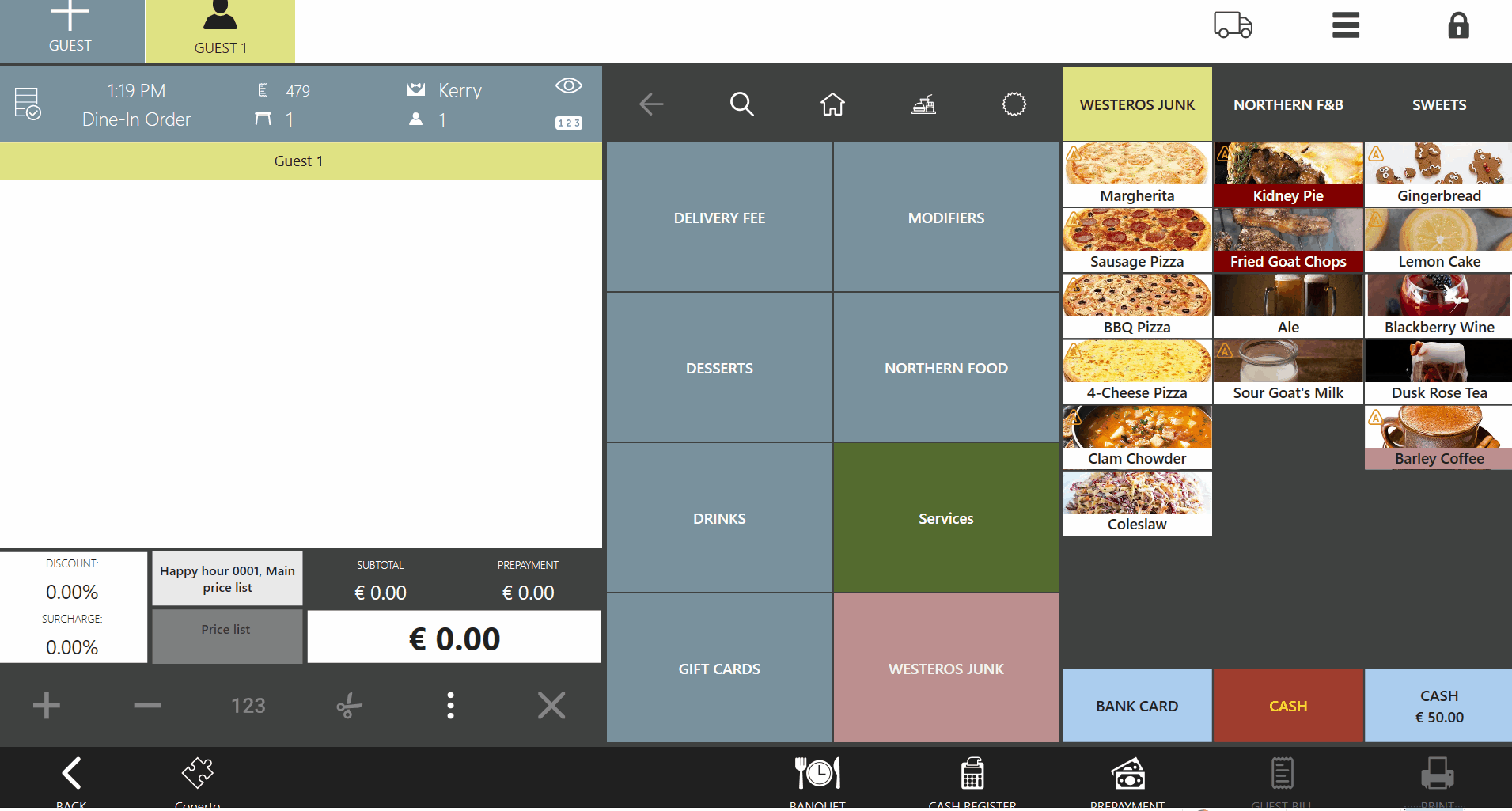 Aby przyjąć płatność za pomocą przycisków szybkiej płatności, przyjmij zamówienie od gościa, a następnie dotknij wymaganego przycisku („Karta bankowa”, „Gotówka”, „£50” lub inny skonfigurowany typ płatności) w prawym dolnym rogu ekranu przyjmowania zamówień. Zamówienie zostanie opłacone, a system wydrukuje rachunek bez przełączania się na ekran kasy.