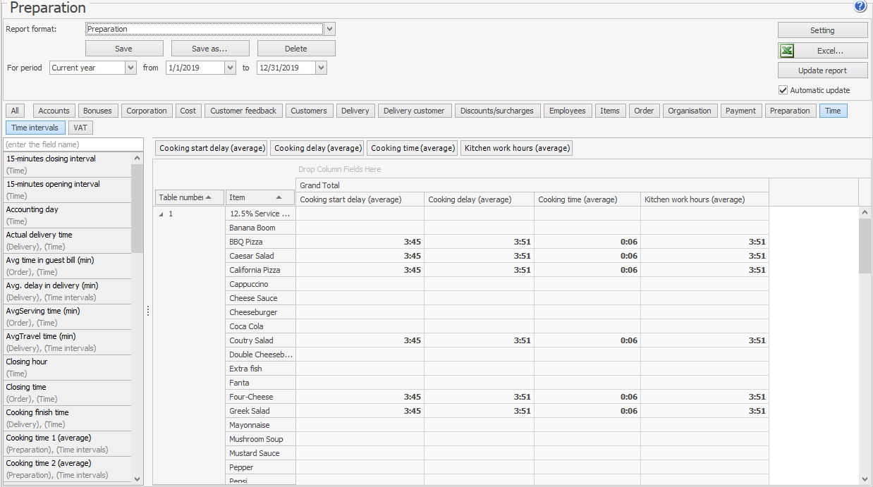 Godziny pracy kuchni pozwalają ocenić, ile czasu kuchnia poświęca na przygotowanie dań, a w przypadku problemów z obsługą pomagają zrozumieć, czy występują błędy po stronie kuchni. Jest to czas od wydruku pozycji do zakończenia gotowania.