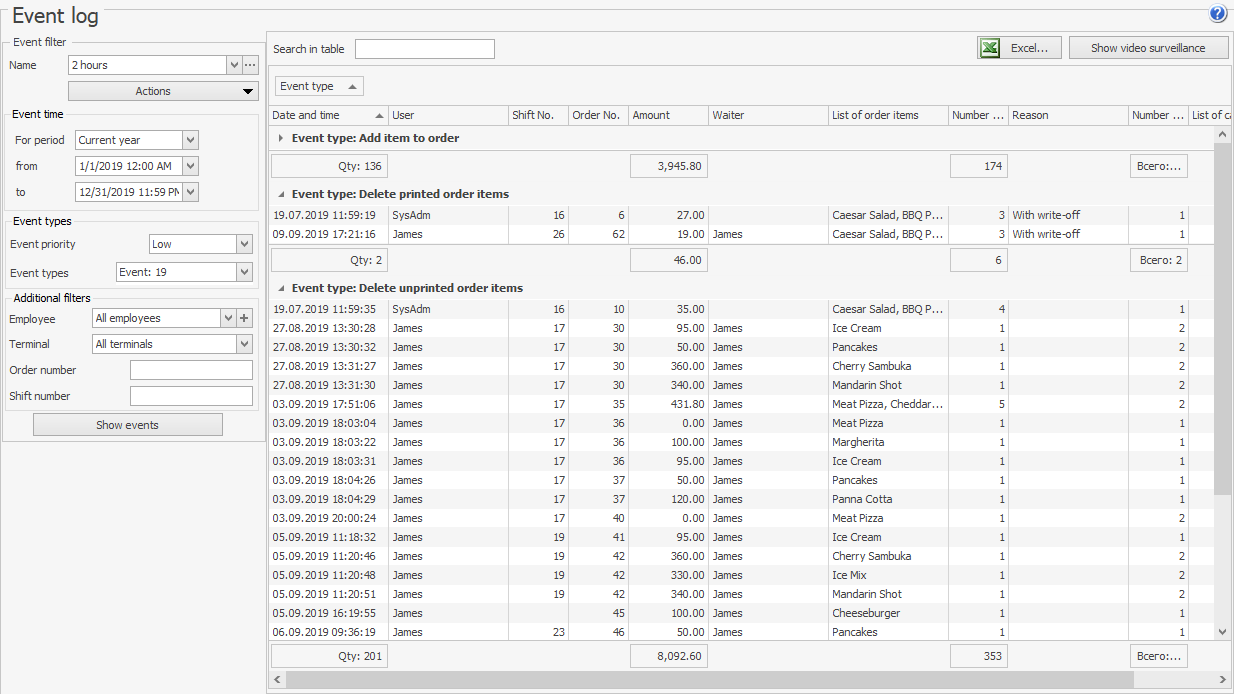 Wszystkie szczegóły od gotowania do podania są rejestrowane w Dzienniku zdarzeń w Syrve Office (Sprzedaż detaliczna > Dziennik zdarzeń > Typy zdarzeń > Praca z pozycjami zamówienia). Aby ocenić jakość obsługi klienta, uruchom raport obejmujący następujące zdarzenia: