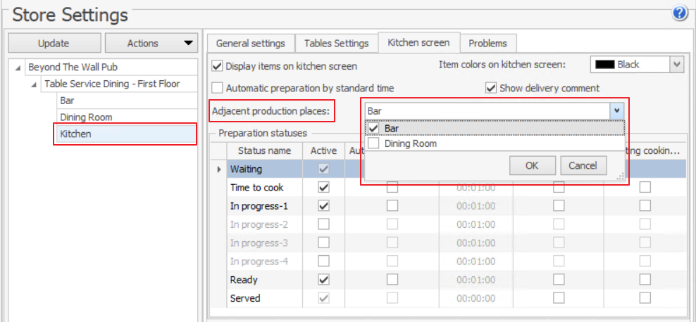 Gdy obsługujesz duże grupy lub bankiety w restauracji fine-dining, możesz chcieć widzieć, co inne kuchnie przygotowują dla tych samych gości, aby móc podać im jednocześnie i uniknąć opóźnień. W tym celu przejdź do Ustawienia Sklepu > Ekran Kuchenny w aplikacji back-office i wybierz sąsiednie miejsca, jak pokazano na poniższym obrazku.