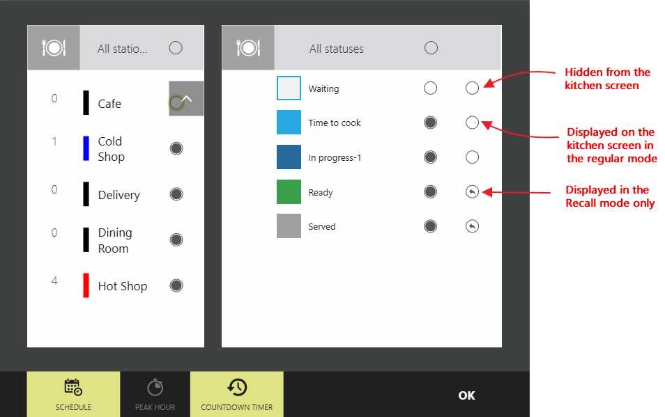Na przykład na stanowisku obsługi potrzebujesz, aby wszystkie pozycje menu były wyświetlane z wyjątkiem tych podanych. Możesz je zobaczyć tylko w specjalnym trybie Przypomnienia. Szef kuchni powinien widzieć wszystkie dania z wyjątkiem przygotowanych. Przygotowane dania powinny być wyświetlane szefowi kuchni tylko w trybie Przypomnienia, natomiast podane nie są w ogóle pokazywane.