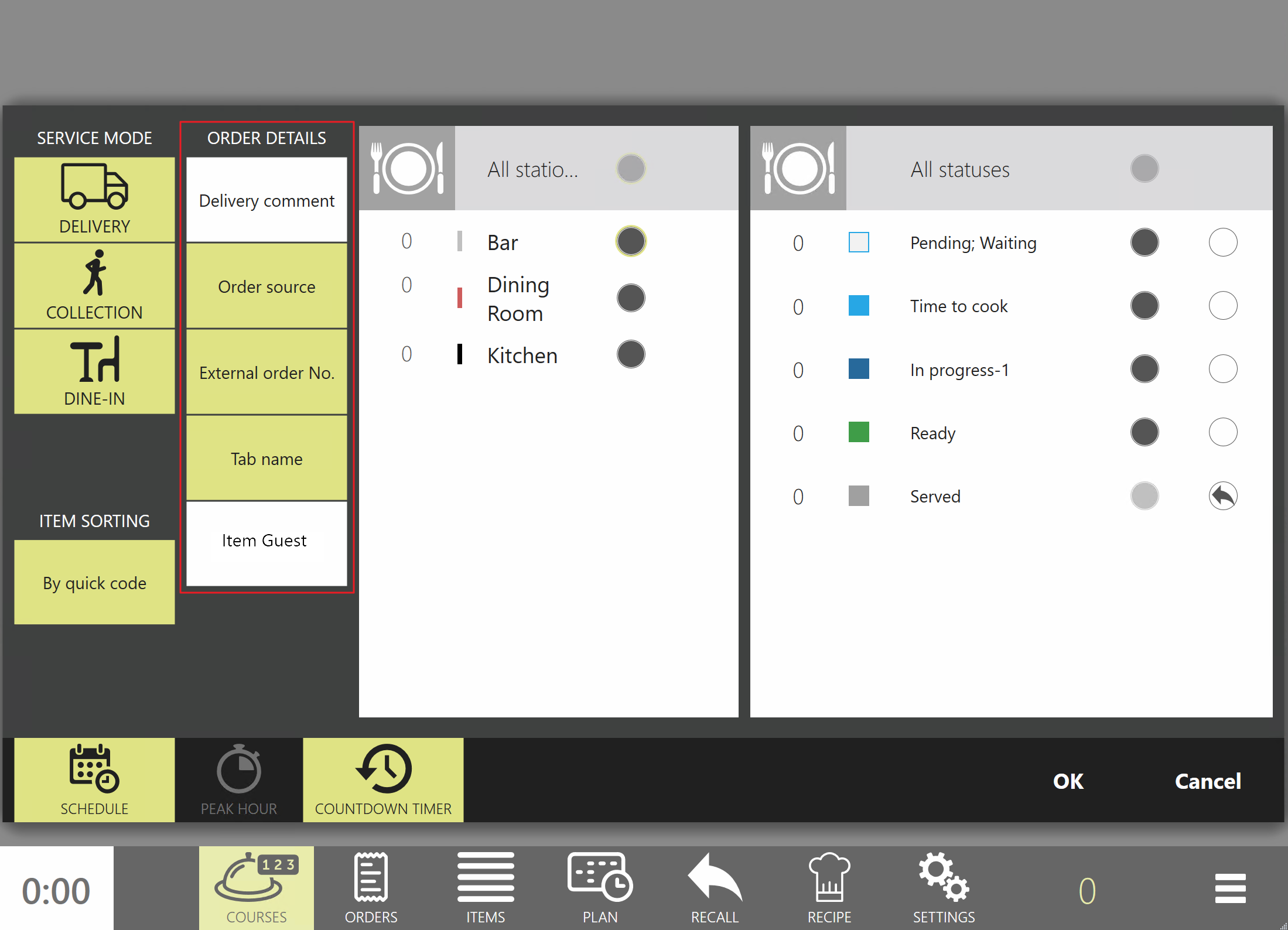 Jeśli jednak na przykład personel gorącej kuchni nie chce widzieć pozycji z kuchni zimnej, mogą one zostać ukryte na ekranie za pomocą ich statusu lub trybu obsługi. Aby to zrobić, użyj filtrów w sekcji Ustawienia — .
