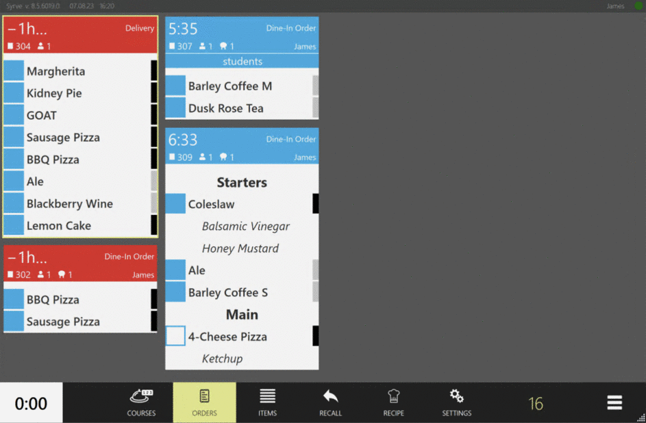 Na KDS możesz filtrować zamówienia według trybu obsługi: Dine-In (na miejscu), Dostawa i Odbiór. Personel kuchni, taki jak pakowacze, może uznać tę opcję za przydatną, ponieważ mogą ustawić ekran tak, aby nie pokazywał zamówień, które nie wymagają uwagi.