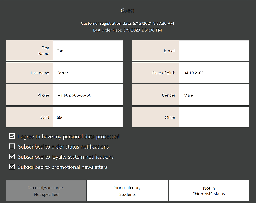 Twoje regulacje mogą wymagać, aby pracownicy pytali klientów o zgodę na przechowywanie ich danych osobowych. Zapytaj gościa, czy wyraża zgodę na przetwarzanie danych osobowych i zaznacz jego odpowiedź w polu Wyrażam zgodę na przetwarzanie moich danych osobowych: