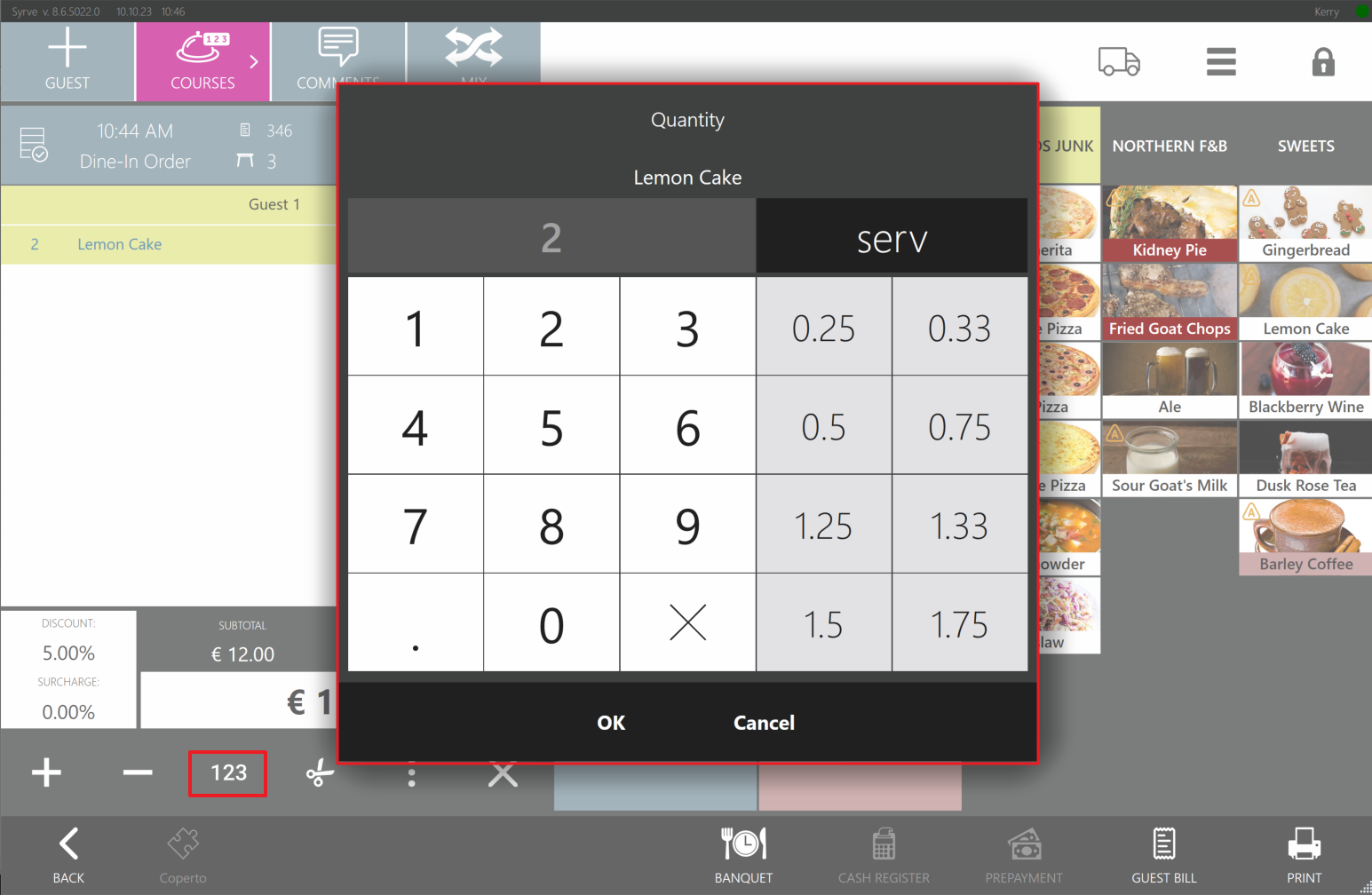 - Kliknij 0.5 (lub określ dowolny inny mnożnik). W zamówieniu gościa zostanie wyświetlona wskazana ilość dania.