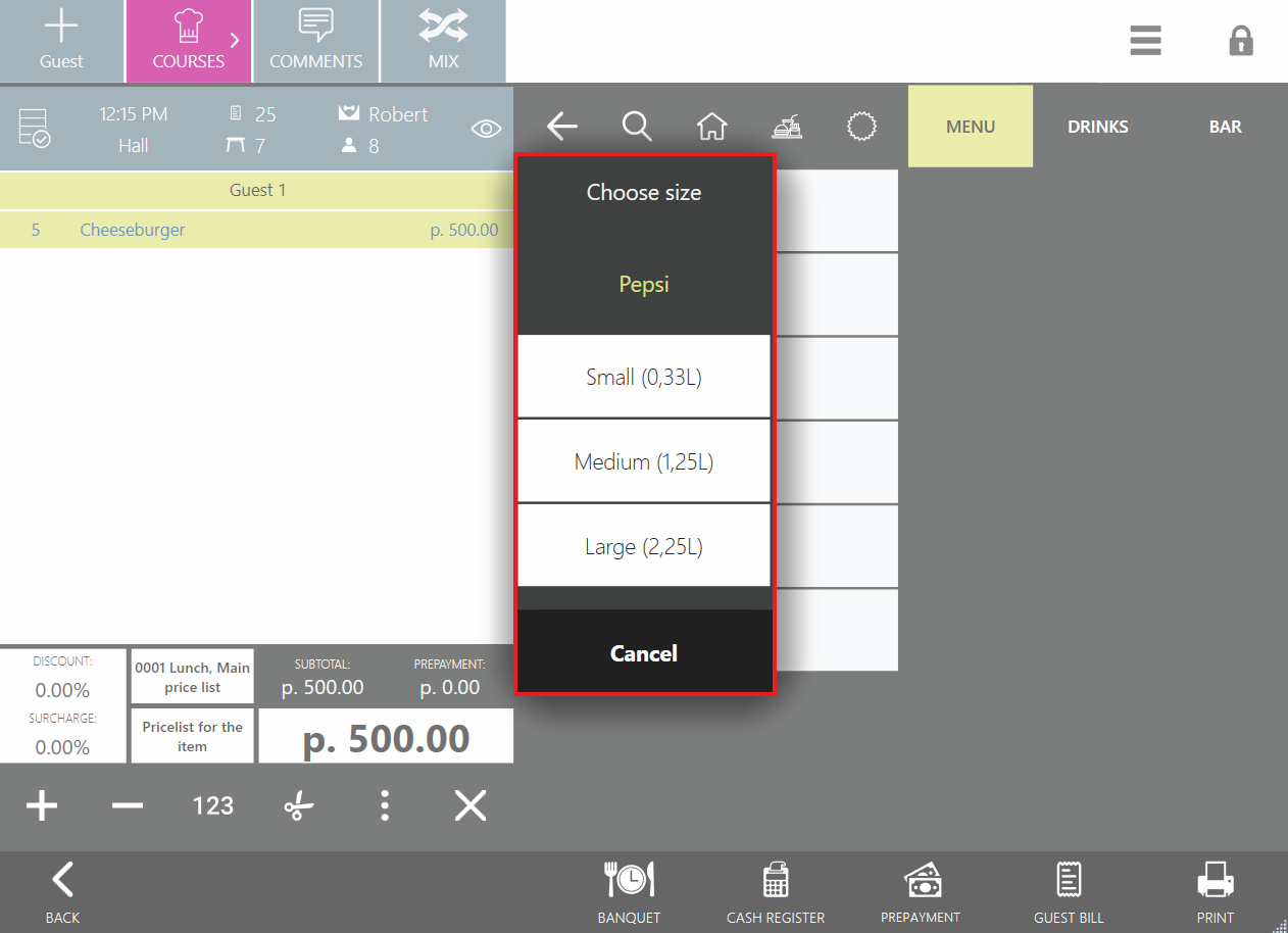 Jeśli karta listy magazynowej potrawy wskazuje domyślnie ustawiony rozmiar, system doda ten rozmiar do zamówienia. Aby wybrać inny rozmiar, kliknij i wybierz wymagany rozmiar.