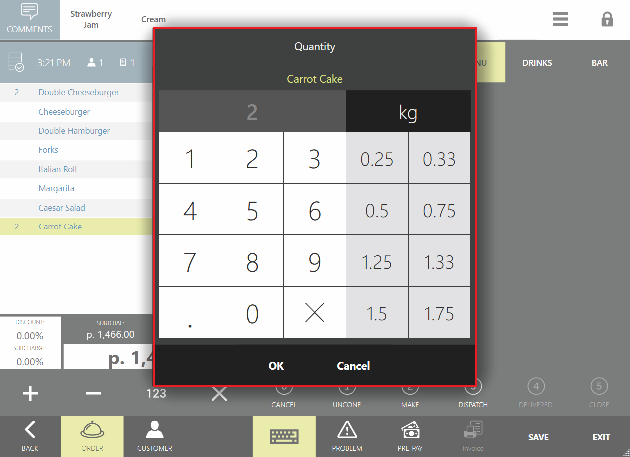 - Spowoduje to automatyczne otwarcie okna Ilość, a jeśli waga działa prawidłowo, okno wyświetli wagę dania w kilogramach.
