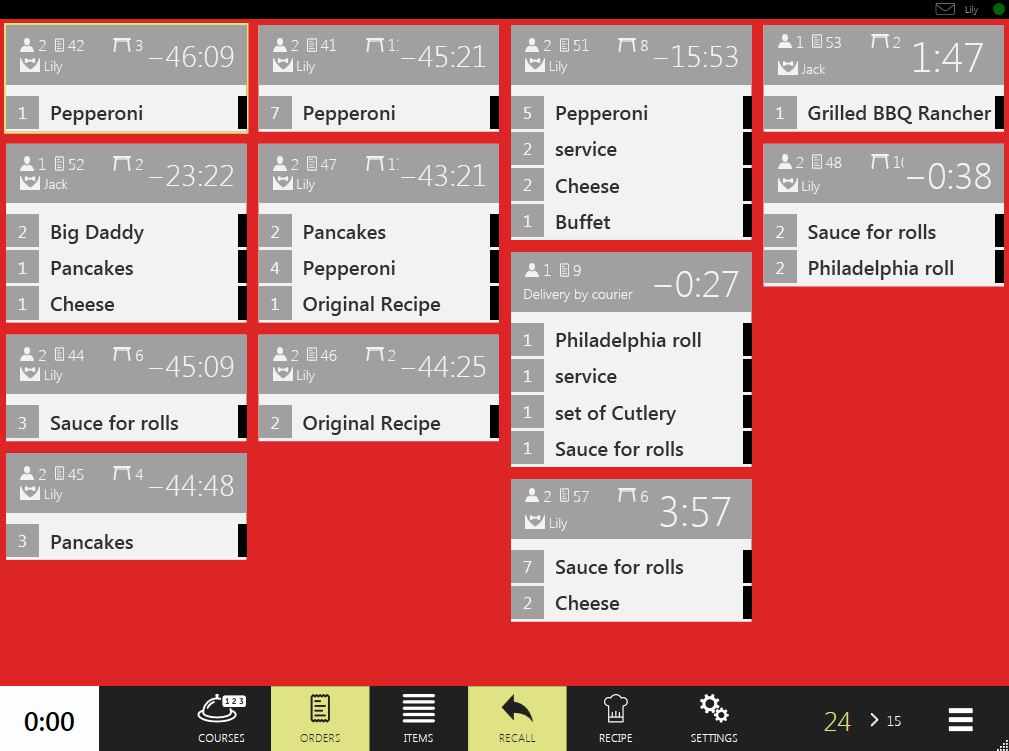 Usunięte pozycje są przekreślone i nie można cofnąć tej operacji z poziomu ekranu kuchni. Na przykład kucharz zamknął usuniętą pozycję. Potem się rozproszył i zapomniał, której pozycji już nie musi gotować. Kucharz może przełączyć się w tryb Recall i znaleźć usunięte pozycje.