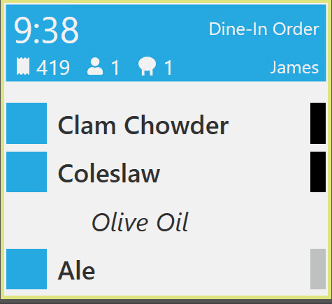 - Kelner dodaje pozycje do zamówienia i drukuje je do kuchni. Pozycje pojawiają się na ekranie kuchni ze statusem Czas gotowania. Na ekranie wyświetlany jest czas gotowania. Jeśli minęła połowa domyślnego czasu gotowania, ale przygotowanie jeszcze się nie rozpoczęło, pozycje automatycznie stają się pilne.