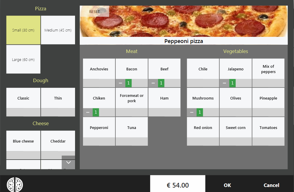 Zdarza się, że punkty sprzedaży oferują swoim gościom możliwość komponowania pizz, czyli wyboru nie tylko rozmiaru, ale także rodzaju ciasta (grube, cienkie, zamknięte) oraz dodatków. Co więcej, można podzielić pizzę na dwie części i wybrać różne składniki dla każdej połowy. Takie produkty można skonfigurować w aplikacji back-office na komputerze, korzystając ze schematów modyfikatorów.