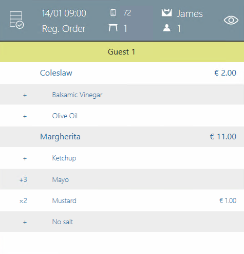 Wybrany modyfikator podświetli się na żółto. Naciśnij nazwę modyfikatora, aby dodać go do produktu. Aby usunąć modyfikator, naciśnij przycisk „-”. Jeśli ilość modyfikatora jest podświetlona na zielono, możesz ją uzupełnić tym samym modyfikatorem lub innym z grupy.