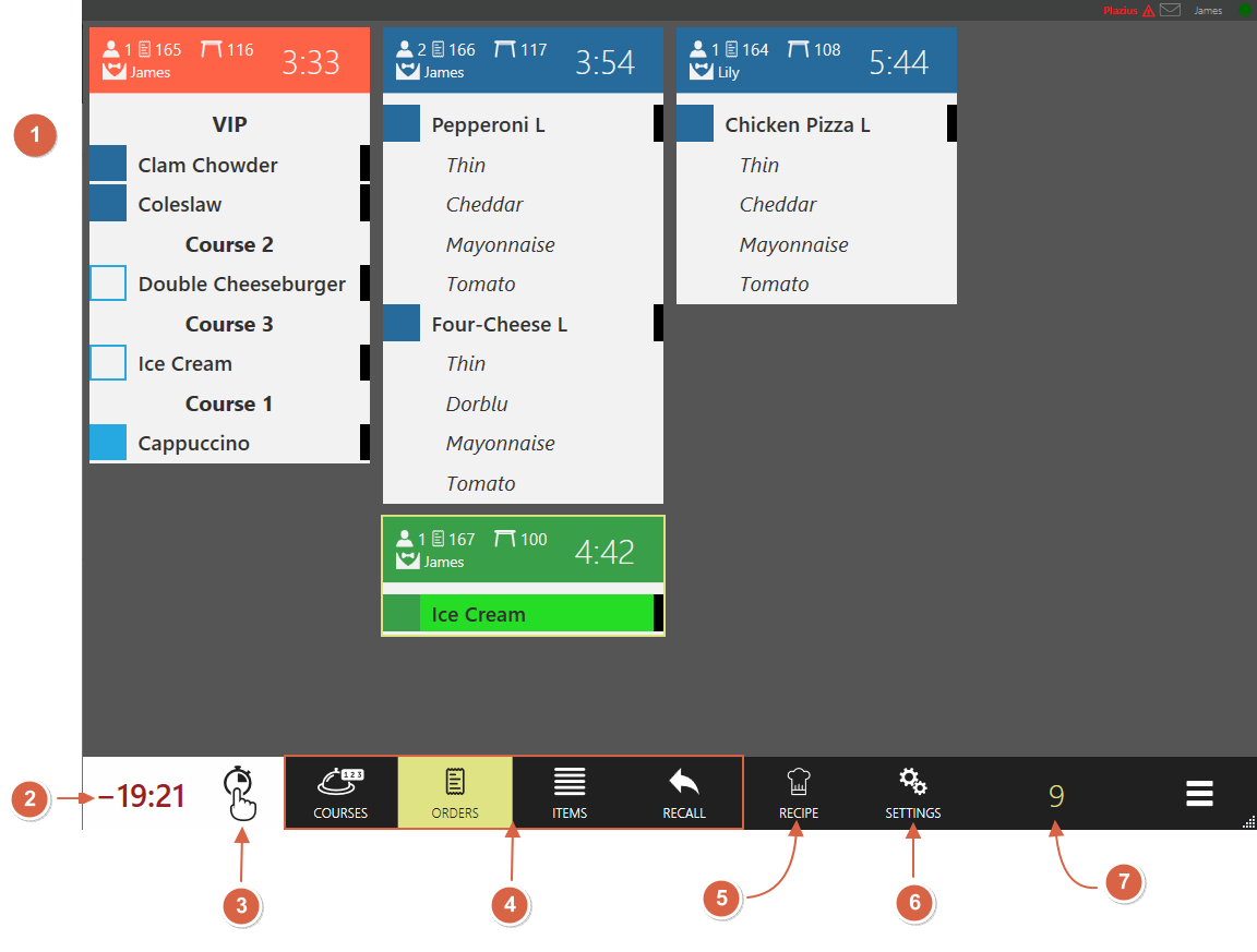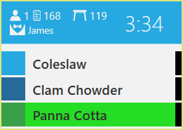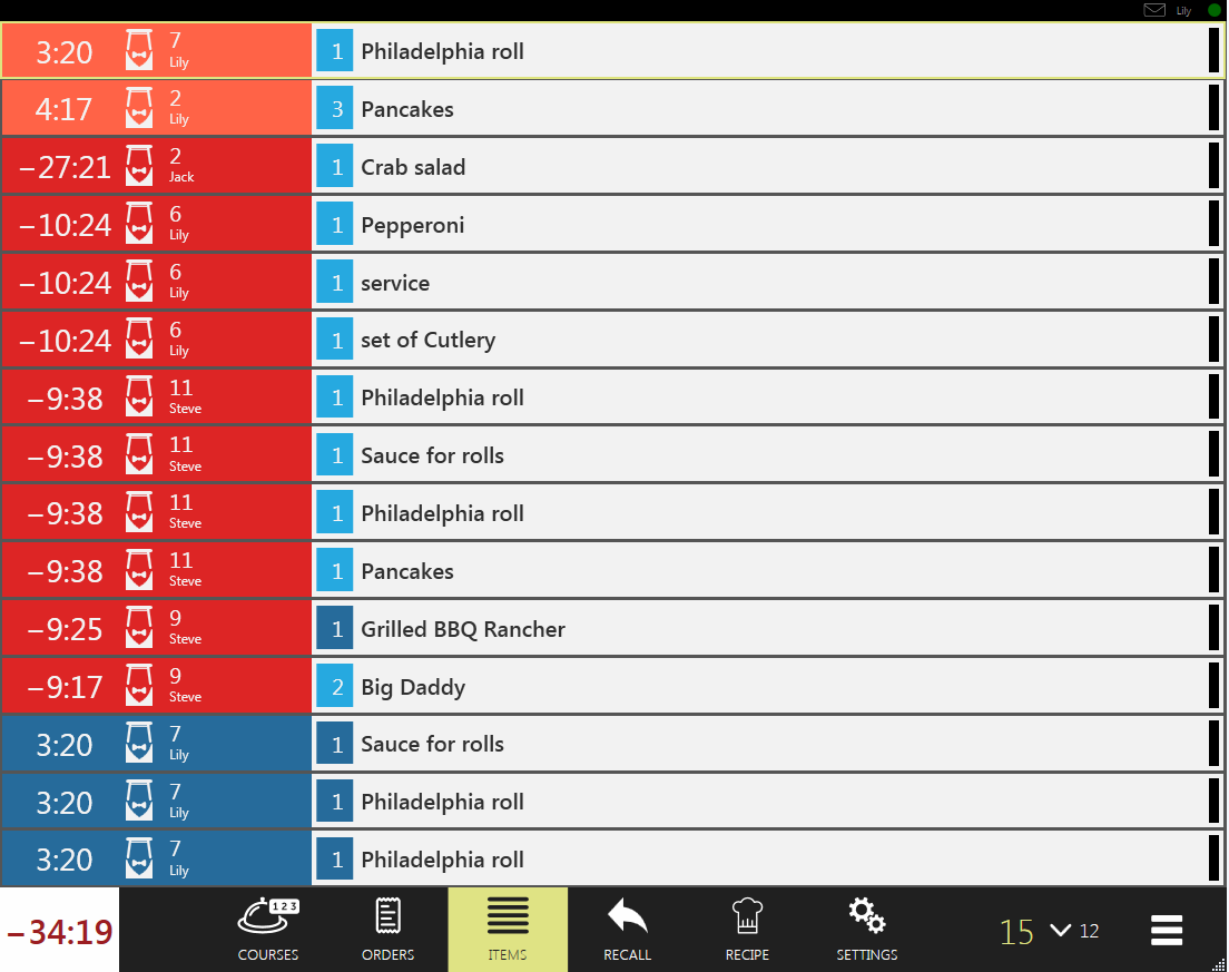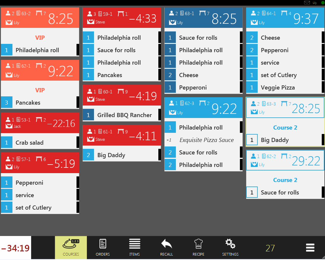 - Dania. Zamówienia są najpierw dzielone i grupowane według dań, a następnie według czasu przygotowania w kolejności rosnącej. Najpilniejsze danie jest podane w lewym górnym rogu. Pozycje pilne muszą być przygotowane i podane jako pierwsze. Takie pozycje są wyróżnione.