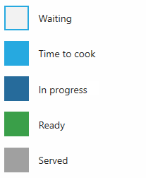 Status przygotowania pozycji jest podawany na ekranie kuchennym jako kolorowy prostokąt po lewej stronie nazwy pozycji. Status zamówienia jest wskazywany przez kolor czcionki zamówienia.