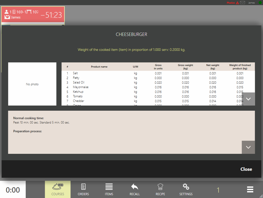 Przepis możesz zobaczyć w dowolnym trybie. W tym celu dotknij nazwy pozycji, a następnie RECIPE w zamówieniu lub kursie. Jeśli pozycja jest drukowana w jednym z rozmiarów, przepis będzie podany dla tego konkretnego rozmiaru.