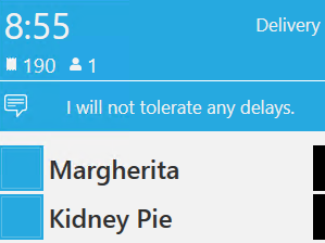 Tutaj pozycje są grupowane według kolejności podania i wygodnie jest je umieścić na tacy i podać. Ekran pokazuje, które pozycje są gotowe, a które są jeszcze przygotowywane. Pokazuje też moment, kiedy wszystkie pozycje są gotowe i pomocnicy mogą je odebrać.