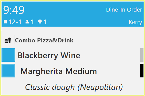 Modyfikator i główna pozycja, które są przygotowywane razem, będą wyświetlane razem. Taki modyfikator ma ten sam status i kolor co główna pozycja. Sklep i czas przygotowania są wyświetlane tylko dla głównej pozycji. Każda pozycja ma swoje modyfikatory (jeśli są) wyświetlane tak, jak na ekranie zamówienia.
