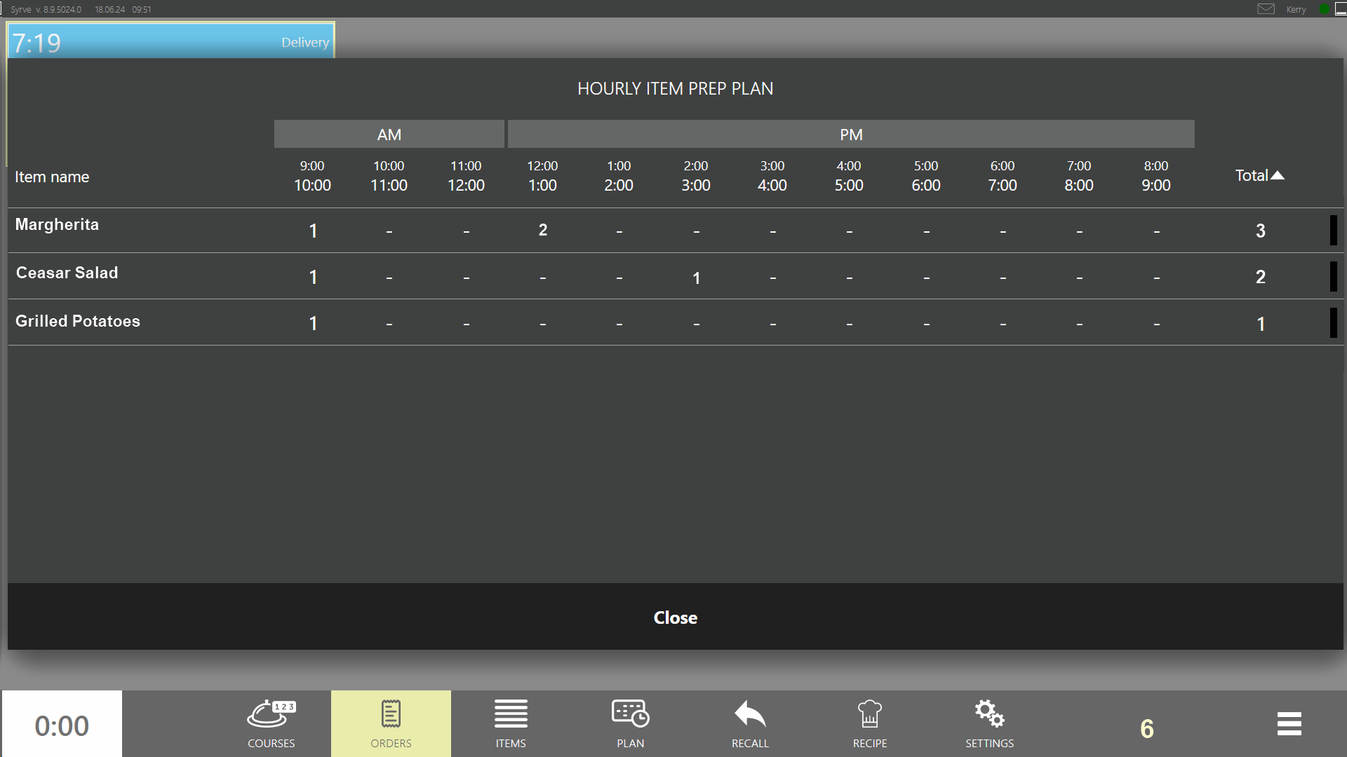 Użyj tego trybu, aby zobaczyć pozycje zamówione na dowóz lub odbiór na określony czas w przyszłości. Tutaj możesz zobaczyć zamówione pozycje, ich ilość oraz czas dostawy lub odbioru. Okno wyświetla plan gotowania na następne 12 godzin.