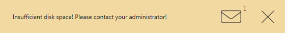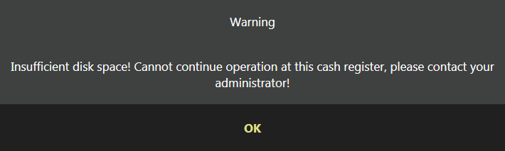 Po osiągnięciu drugiego progu na ekranie pojawi się następujące okno dialogowe i nie będzie można korzystać z POS, dopóki nie zostanie udostępnione więcej miejsca na dysku.